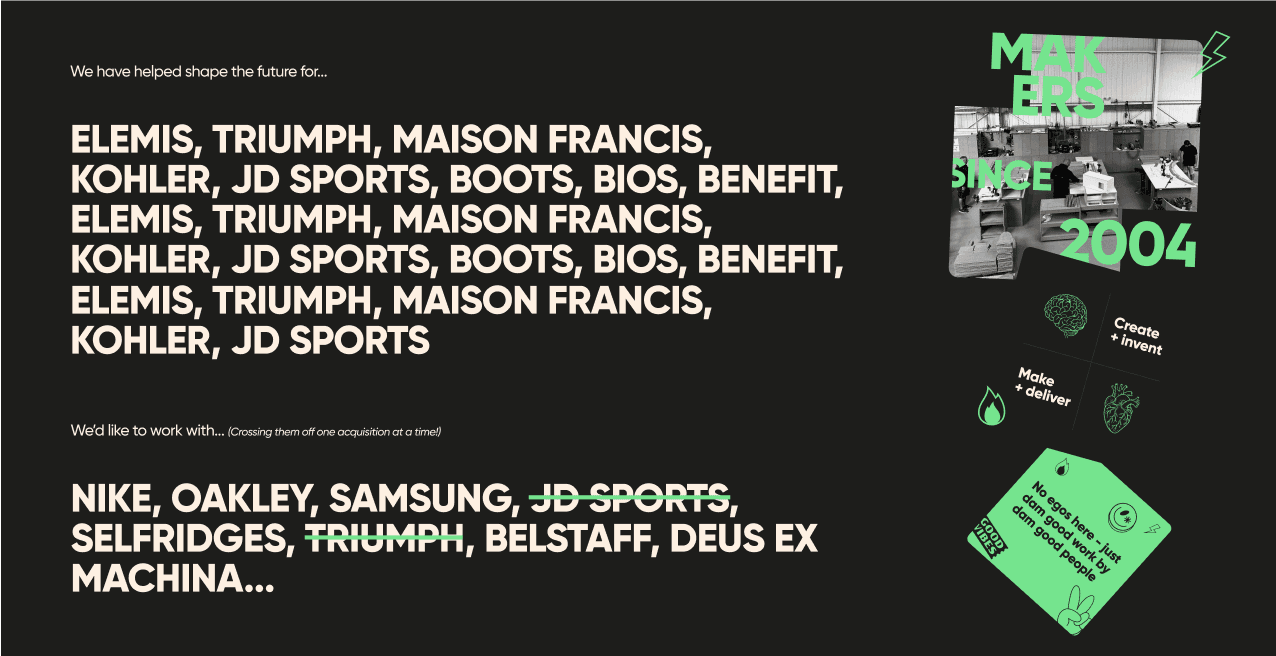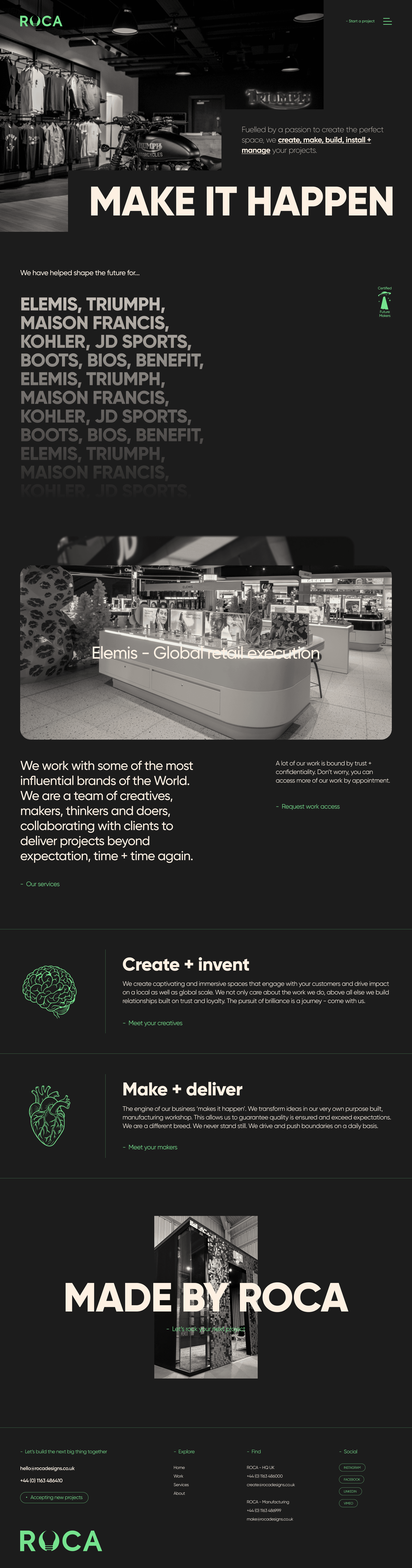 Roca work with some of the most influential brands of the World. A team of creatives, makers, thinkers and doers, collaborating with clients to deliver projects beyond expectation, time + time again. Brands such as Nike, Escentric Molecules, Maison Francis Kurkdjian, Kohler, Jd Sports, Boots, Bios, Benefit, Maniere De Voir to name but a few. These guys just make 'shit' happen.